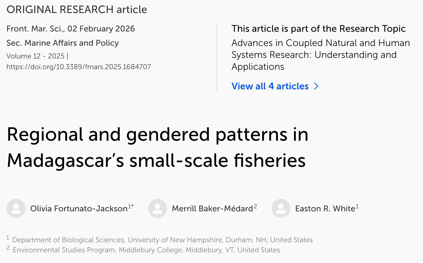 Led by Olivia Fortunato-Jackson, in collaboration with Merrill Baker-Médard, we published a paper on fisheries catch among small-scale operations in Madagascar. The work is part of our larger National Science Foundation grant on understanding the relationship between social and ecological dynamics in Malagasy fisheries. We examined over 9,000 fishing trips across 17 villages to assess how catch differs for men versus women, by gear type, and in proximity to healthy reef areas. The article already has over 500 views online.